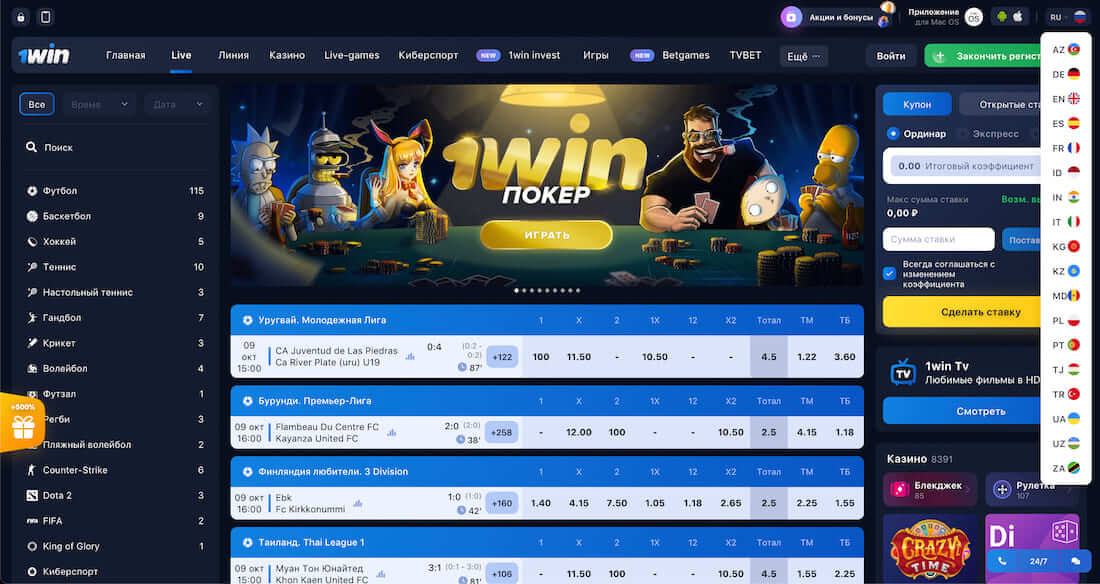 Перевести 1Win можно на 21 язык, включая русский. В футере сайта расположены логотипы поддерживаемых методов оплаты, компании-партнеры, находится ссылка для скачивания приложения и аккаунты в социальных сетях.